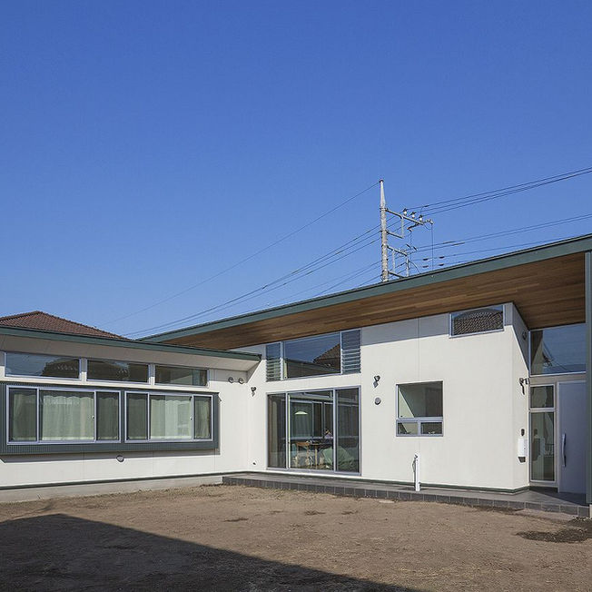広い敷地内に建てられたL字型の平屋の家です。